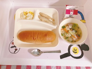 「スープ」は、豚肉、キャベツ、たまねぎ、にんじん、青みにさんどまめを使用したスープです。