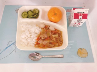 「中華丼」は、豚肉、うずら卵を主材に、はくさい、たまねぎ、たけのこ、にんじん、しょうが、しいたけを使用しています。中華丼は、【うずら卵】の個別対応献立です。
