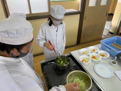 家庭科で、ゆで野菜サラダを作りました。今年度初めての調理実習でした。野菜を切ったり、ゆでたりと班で協力しながら作ることができました。