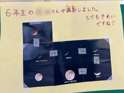 先週の部分月食の様子を6年生の児童がカメラで撮影し、写真を学校で見せてくれました。月の形が変化する様子やクレーターがはっきりわかり、朝登校してきた児童が「きれい〜!」「すごいな〜!」とじっくり見ていました。
