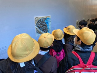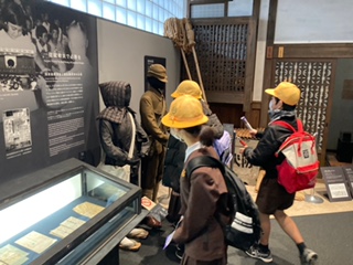 大阪空襲についての展示を見学しています。戦争の悲惨さを実感しているようです。