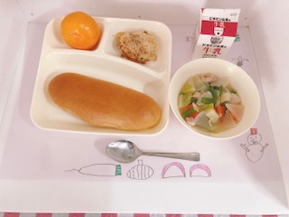「鶏肉とじゃがいものスープ煮」は、鶏肉を主材にじゃがいも、キャベツ、だいこん、にんじん、さんどまめを使用した洋風の煮ものです。