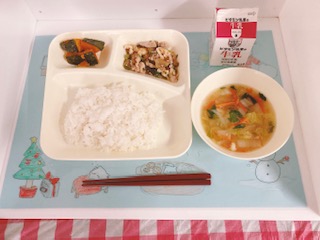 「うすくず汁」は、鶏肉、はくさい、だいこんなどを使用した具だくさんの汁もので、片栗粉でとろみをつけ、青みにみつばを使用しています。