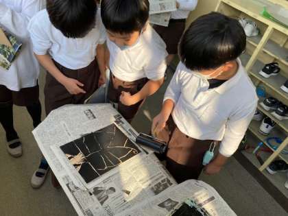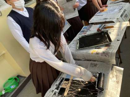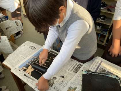 4年生の12月の図画工作科では、木版画に取り組みました。初めて彫刻刀を使って木を彫り、ローラーで墨を塗り、バレンを使って擦り出しました。みんな安全に気をつけて完成させることができました。