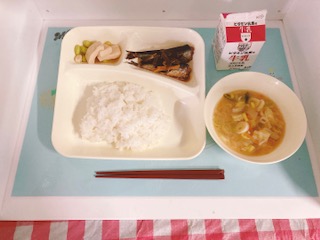 「いわしのしょうが煮」は、1人2尾のいわしをしょうが、切りこんぶ、調味液とともにミニバットに入れ、焼き物機で煮ます。