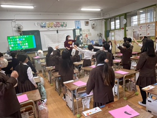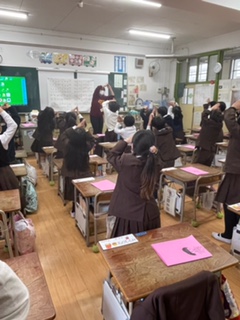 1年生の音楽の授業風景です。感染予防対策をしながら、歌やダンスを交えて楽しく授業をしています。ここから打楽器なども入れて合奏へとつなげていきます。どんな合奏になるか楽しみですね。