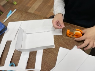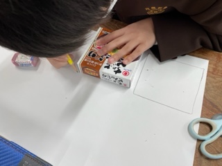 算数科の学習ではこの形を学習しています。それぞれ選んだはこを画用紙に写し取って組み立てている様子です。「面は6つあるから一つ多いな」や「向かいあう面の大きさは同じじゃないと組み立てられないな」など学習したことを基に黙々と取り組んでいました。
