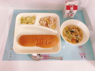 「中華おこわ」は、もち米に焼き豚、くり、しいたけ、調味液を加えて蒸し焼きにする。チキンブイヨンとごま油でコクと旨味を出した児童に人気の一品です。