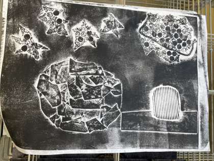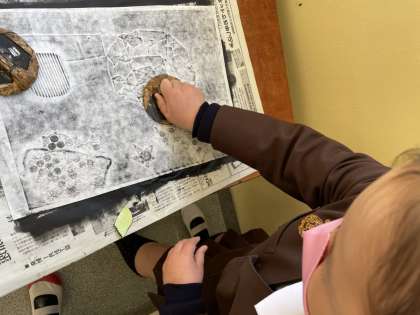 図画工作の学習で、版画あそびをしています。いろいろな素材を使って板面に図柄を作り、印刷します。今回のテーマは宇宙です。それぞれが思い描く宇宙を表現することができました。