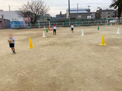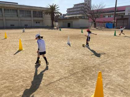 「足を横に向けて蹴る」「ボールの横に足を置いて蹴る」など、上手くボールを操作できるためのコツを知ってから、コーンをジグザグに進んでみたり、コーンに当てたりと、楽しんで活動しています。