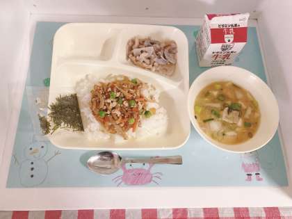「鶏ごぼうご飯」は、しょうが汁で下味をつけた鶏ひき肉を主材に、つきこんにゃく、ごぼう、にんじん、グリンピースを使用しています。児童に大変好評な献立です。きざみのりをかけて食べます。