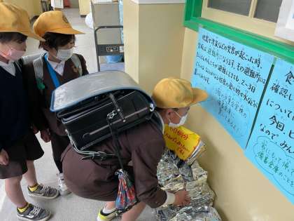もしも、地震や津波などの災害が起こった時、学校は避難所の役割をします。「備蓄倉庫」には、たくさんの食べ物や水などの災害物資が保管されているということを確認しました。