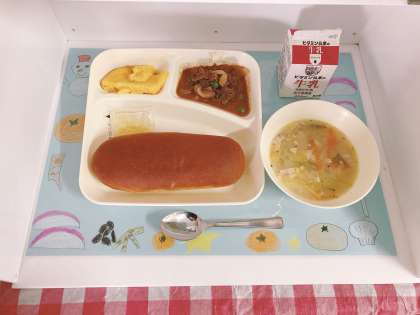 「コーンスープ」は、ベーコンの旨味をとスイートコーンの甘みが調和した、児童に人気のあるスープです。彩りにパセリを使用しています。