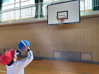 体育科の学習で「ボール投げあそび」をしています。ゴールに向かってボールを投げる活動では、ゴールを狙って一生懸命頑張っています。