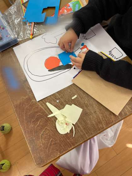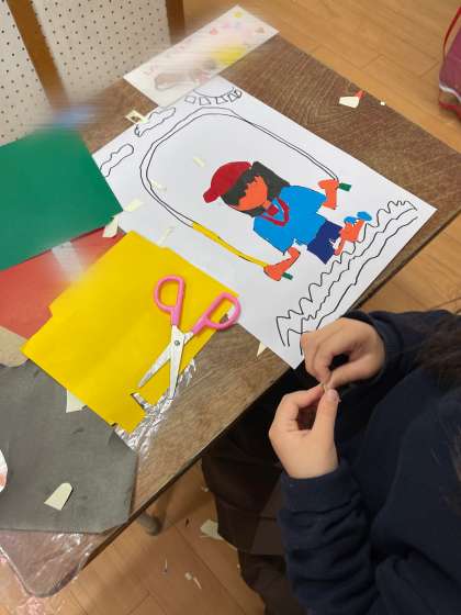 絵のように描く線では、版画にならないということを、カラーのシールで形を作って、はりつけながら理解しています。