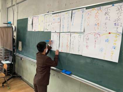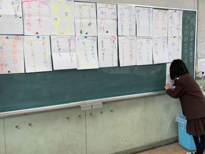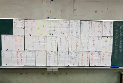 国語科で「同じ読み方の漢字」の学習のまとめとして、全員が同音異義語の漢字を使っての問題を考え、解き合う活動をしました。4年生までに学習したことを活かして発表することができました。