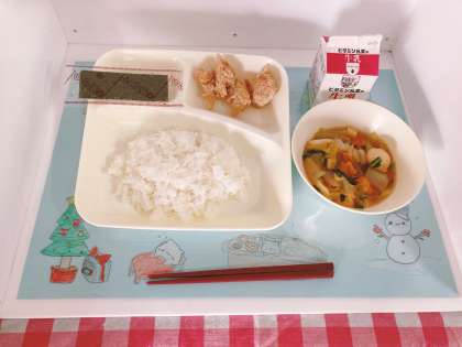 「鶏肉のからあげ」は、鶏肉に、しょうが汁、みじん切りのにんにくなどで下味をつけ、でん粉をまぶしてなたね油であげます。