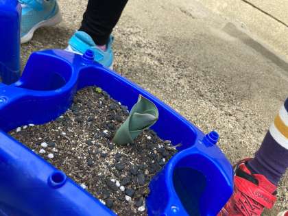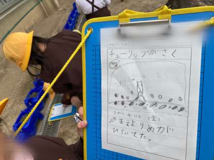 チューリップの観察をしました。ここ最近で温かくなってきたためか、今まで小さく出ていた芽が、大きくなり始めています。その様子を見て、