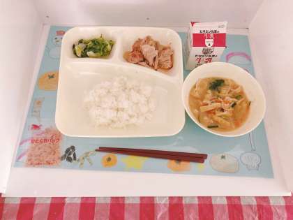 「豚肉のしょうが焼き」は、豚肉にしょうが汁、砂糖、料理酒、みりん、こいくちしょうゆ、綿実油で下味をつけ、たまねぎを混ぜ合わせて、焼き物機で焼きます。