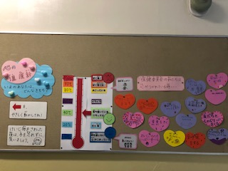 保健室の前に、「心の温度計」を掲示しています。怒っていたり、イライラしていたり、リラックスしていたり、緊張していたり・・・。いろんな気持ちの時があると思います。温度計の矢印は動かすことができ、今の自分の温度を確かめられるようになっていて、子どもたちがよく動かしています。心が爆発しそうなとき、凍っていて何も感じない時は、誰かに話してほしいと思います。