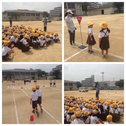 大正警察の方々が来てくださり、交通安全について学習しました。信号機や止まれの道路標識について学習した後、2人1組になって横断歩道を歩く練習をしました。車や障害物がある時には必ず、安全を確かめてから道路の端を通って歩きます。これからも交通ルールを守って、安全に過ごせるようにしましょう。