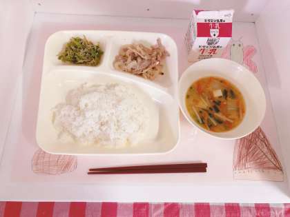 「みそ汁」は、とうふ、キャベツ、にんじん、えのきたけを使った具だくさんのみそ汁です。青みに青ねぎを使用しています。