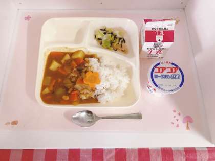 今月のカレーライスは、ドライパックの大豆を加えた「牛肉と大豆のカレーライス」です。ドライパックの大豆は蒸してあるので、水に溶けだしやすい栄養成分の流失を最大限に抑え、大豆本来の旨味も味わうことができます。