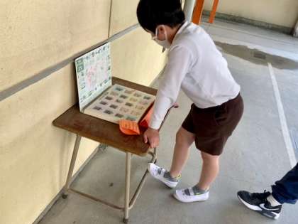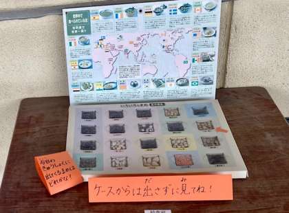 給食室前には、いろいろな豆を展示しました。栄養たっぷりの豆をたくさん食べてほしいですね♪