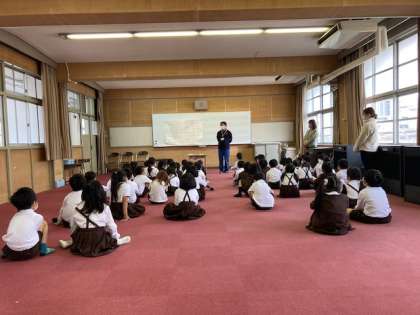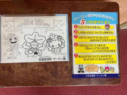 2時間目に大正区役所 ツージィ隊 地域協働課 防災防犯グループの方が交通安全指導に来てくださいました。いつも子どもたちの安全を守るためにパトロールもしてくださっています。一人ひとりに5つのやくそくをいただきました。
