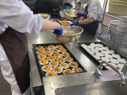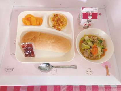 「豚肉と野菜のカレースープ煮」は、豚肉を主材に、じゃがいも、たまねぎ、キャベツ、にんじん、しめじ、青みにえだまめを使用しています。カレー粉を使用することで、いつものスープ煮の味に変化をつけています。