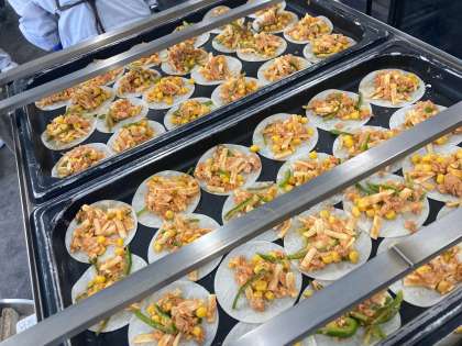「変わりピザ」は、ツナ、コーン、ピーマン、ピザソース、チーズを混ぜ合わせて、ぎょうざの皮にのせ、焼き物機で焼く人気の献立です。