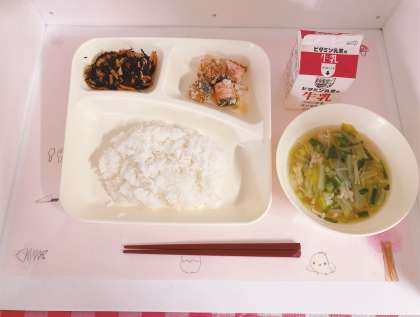 「ひじきのいため煮」は、ひじきとうすあげ、にんじんを砂糖とこいくちしょうゆで味付けし、煮含めています。食物繊維、カルシウムを多く含むひじきは、すすんで食べてほしい食材のひとつです。