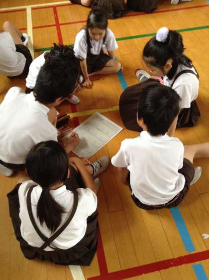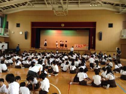 本日のハッピー集会は、集会委員会によるステレオゲーム。ルールは4人が同時に2つの言葉を話し、それぞれの言葉をハッピーグループで考えて当てます。問題は、例えば「とびら」と「てがみ」です。2つしか言ってないのに、聞き分けるのはなかなか難しいです。集中して聞いていないといけません。10人の話を一度に聞き分けたと言われる聖徳太子はとんでもないですね。