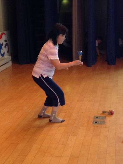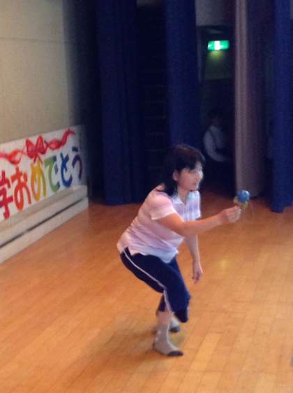 ハッピー集会、ステレオゲームに続いて西脇先生によるけん玉のデモンストレーションが行われました。けん玉のこつはひざ!ひざを使った全身運動だそうです。初歩的な技から、大技へ。最後は「もしかめ」。♪もしもしかめよ、かめさんよ〜の歌に合わせてリズミカルに皿から皿へと玉を載せていきいきます。ノーミスの演技に大きな拍手が送られました。