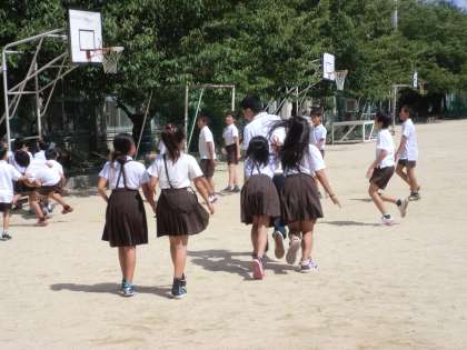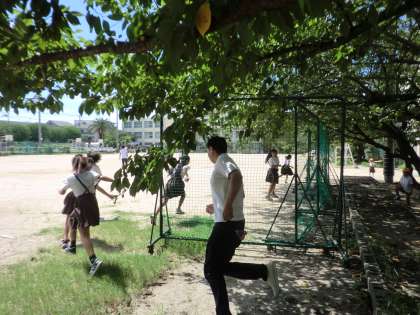 大阪市外国人英語指導員(CーNET) マリオ・リオス先生とお昼休みに鬼ごっこであそぶ子どもたち。はじめての英語授業を受けたあと。