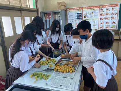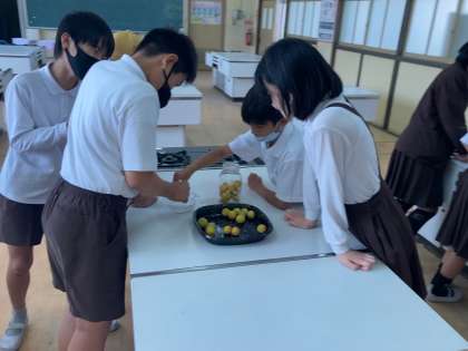 給食委員会のみんなで、収穫した梅をきれいに洗い、塩づけをしました。おいしい梅干しができるか楽しみです♪