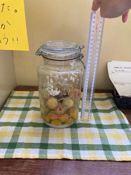 梅干しづくりの様子をみんなで観察できるよう職員室前に展示しています。どんな様子で梅干しが出来上がっていくのか観察してほしいと思います。塩づけした梅は、早速水が出てきています・・・!