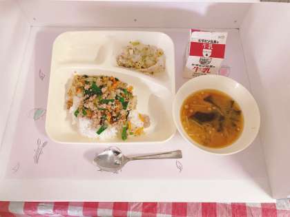「豚ひき肉とにらのそぼろ丼」は、豚ひき肉、にんじん、たまねぎ、青みににらを使っています。ごはんがすすむ、児童に好評な献立です。