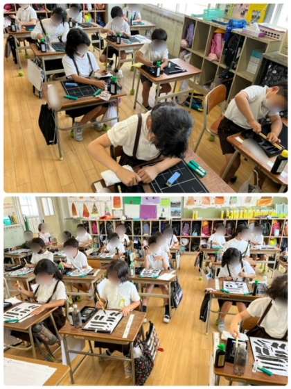 今日は水差しですずりに水を入れ、みんなで墨をすってみました。