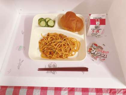 「スパゲッティミートソース」は、牛ひき肉、豚ひき肉を使い、小麦粉と油をよくいためて作るブラウンルウで仕上げます。毎回、児童に好評な献立です。
