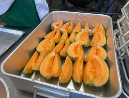 クインシーメロンは、年に1回登場します。今日のクインシーメロンは、茨城県産のものです。小学校分は、全部で49玉のメロンが届きました!これを8分の1の大きさに切ってくださいました。