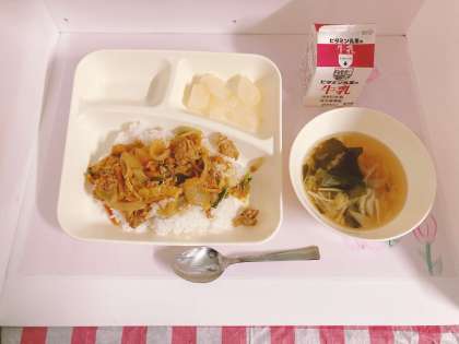 「和風カレー丼」は、だしこんぶとけずりぶしのだしの風味をきかせた和風のカレーをかけて食べる、児童に好評な献立です。