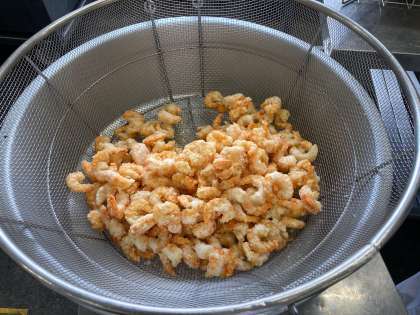 「えびのチリソース」は、塩、こしょう、料理酒で下味をつけたえびに片栗粉をまぶし、なたね油であげます。しょうが、にんにく、トウバンジャンを香りよくいため、砂糖、こいくちしょうゆ、ケチャップを合わせた、少し辛みのきいたソースをからめます。
