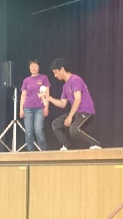 6月20日(土)、土曜授業。1時間目の授業公開後、講堂にてhidenoriさんたちを講師に迎えたけん玉大会を行いました。