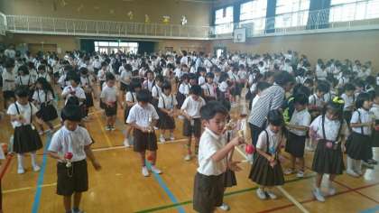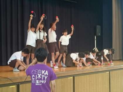 一人一つずつけん玉を首にかけ(けん玉ルック)、全校児童が集まり、初歩的な技から、すばらしい名人級の技まで紹介されました。けん玉は慣れていない子には難しいかな、と心配していましたが、まずは床に置いてバランスよく玉をのせる活動から始まり、もち方、玉の引き揚げ方など細かいステップで教えていただき、1年生からでも無理なく技を習得できました。「できた!」という声があちこちから聞こえ、みんなの笑顔がはじけました。また、「たこ焼き一丁」というゲームが大変盛り上がり、6年生の児童がチャンピオンに輝きました。