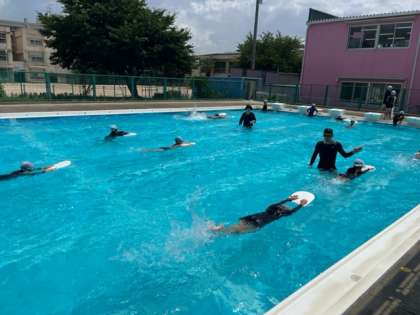 4年生では水中ジャンプ(ブクブクパー)で水中の呼吸、ビート板を使ってバタ足、歩きながらクロールの手、ペットボトルを浮きにしてクロールと段階をふんで、長い距離を泳げるように練習しています。