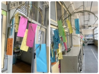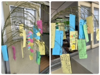 七夕飾りとともに、教室前の笹につるしています。