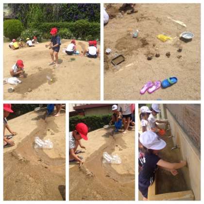 ケーキを作ったり、川を作ったり、池の中に浮かぶお城を作ったりしていました。途中からは「サンダルいらない。裸足になる。」と言って夢中で泥遊びをしていました。一人が脱ぐと、「私も」、「僕も」と、どんどん裸足になる人が増え「裸足きもちいい。」とうれしそうでした。また一人で何かを作るのではなく、友だちと協力して作る大切さも感じているようでした。最後には片づけもきちんと行うことができました。