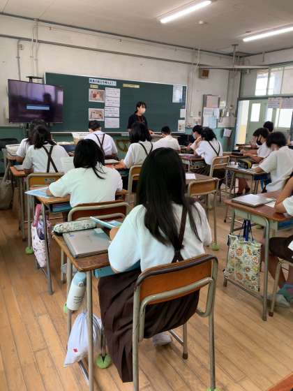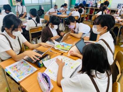 6年生では、『学校給食献立コンクール』に向けて、献立を立てる練習をしました。献立を立てる時のポイントについて学習し、班で話し合ったり、一人一台端末などで調べたりして献立を考えました。