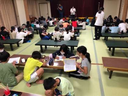 子どもたちは、今日の振り返りをしています。小学校で初めての集団の宿泊経験の1日目が終わりました。子どもたちがイメージした以上に値打ちのある活動ができたと実感できました。川遊びでは、みんな川に浸かって歓声を上げました。こんな経験は大阪ではできません。子どもたちはみんな元気です。子どもたちの活動を支えているのは、担任はじめ付き添いの先生たちが一人ひとりの子どもたちへの声かけを欠かさない事です。これには、感心させられました。コロナ禍であることもありますが、先生たちは子どもたちの健康観察を細かに行なっている事を申し添えで今日の報告を終了致します。